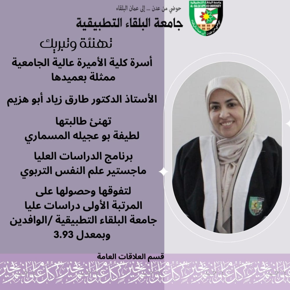 أسرة كلية الأميرة عالية الجامعية تهنئ الطالبة لطيفة المسماري لحصولها على المرتبة الأولى في الدراسات العليا / الوافدين