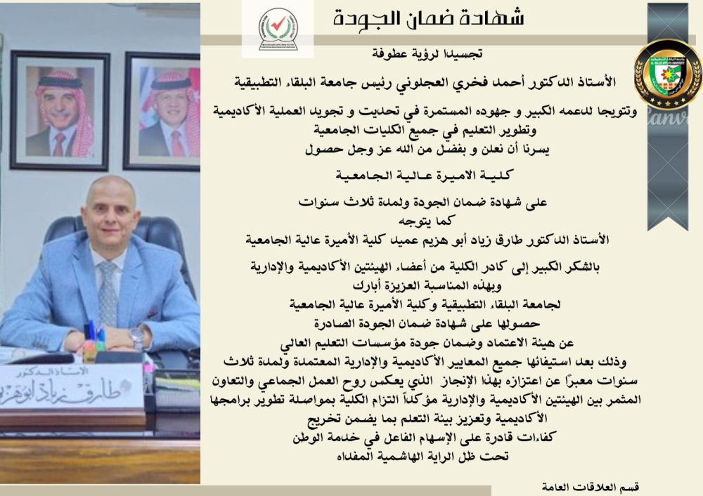 ويُجسد هذا الاعتماد التزام جامعة البلقاء التطبيقية بمواصلة تطوير كلياتها وبرامجها وفق أعلى معايير الجودة والاعتماد، سعيًا لتخريج جيل يمتلك المهارة والمعرفة وروح المبادرة، ويسهم في بناء اقتصاد المعرفة ودفع عجلة التنمية الوطنية.