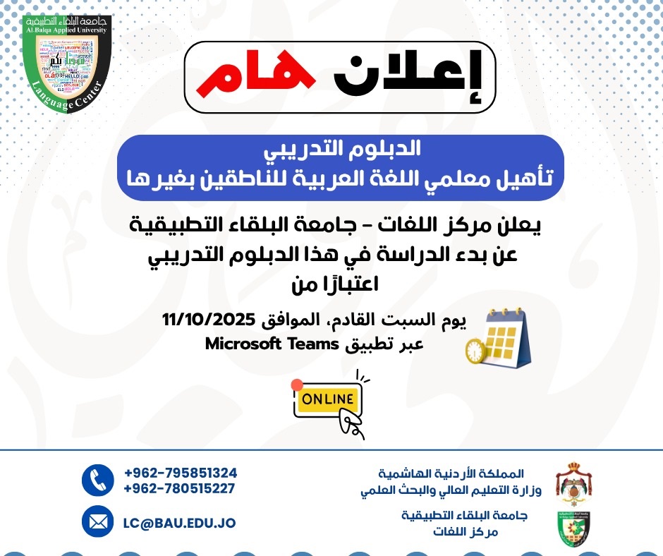 يسرّ مركز اللغات/ جامعة البلقاء التطبيقية أن يعلن عن انطلاق الدراسة في الدبلوم التدريبي (تأهيل معلمي اللغة العربية للناطقين بغيرها)