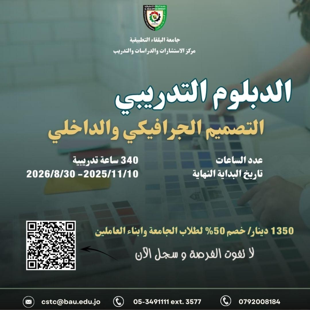 يُعلن مركز الاستشارات والدراسات والتدريب في جامعة البلقاء التطبيقية / المركز عن فتح باب التسجيل في برنامج الدبلوم التدريبي "التصميم الجرافيكي والداخلي" مكان الانعقاد: جامعة البلقاء التطبيقية / المركز مزايا البرنامج: إمكانية تقسيط الرسوم على ثلاثة فصول دراسية أطلق إبداعك وابدأ مسيرتك في عالم التصميم والابتكار، حيث تتحول الفكرة إلى هوية ومكان نابض بالجمال! سجّل الآن عبر الرابط التالي: https://forms.cloud.microsoft/r/8rtjmPm07w?origin=lprLink
