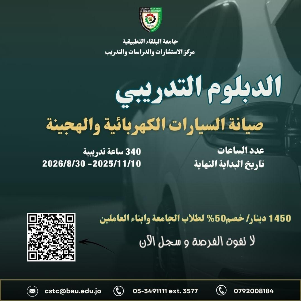 يُعلن مركز الاستشارات والدراسات والتدريب في جامعة البلقاء التطبيقية / المركز عن فتح باب التسجيل في برنامج الدبلوم التدريبي "صيانة السيارات الكهربائية والهجينة" مكان الانعقاد: جامعة البلقاء التطبيقية / المركز مزايا البرنامج: إمكانية تقسيط الرسوم على ثلاثة فصول دراسية تعلّم أحدث تقنيات الصيانة في عالم المركبات الذكية، وكن جزءًا من المستقبل الأخضر لصناعة السيارات! سجّل الآن عبر الرابط التالي: https://forms.cloud.microsoft/r/8rtjmPm07w?origin=lprLink