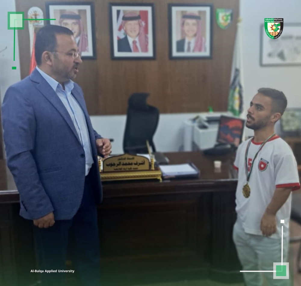 وأكد عميد الكلية الأستاذ الدكتور أشرف محمد الرجوب، أن هذا التكريم جاء تنفيذًا لتوجيهات عطوفة الأستاذ الدكتور أحمد فخري العجلوني رئيس الجامعة، الرامية إلى دعم الأنشطة الرياضية والاهتمام بالطلبة المتميزين، وتعزيز روح المنافسة والإبداع لديهم، وتشجيعهم على تحقيق المزيد من النجاحات، مؤكدًا أن الرياضة تسهم في بناء شخصية الطالب المتكاملة وترفع من مستواه التعليمي والثقافي والاجتماعي .