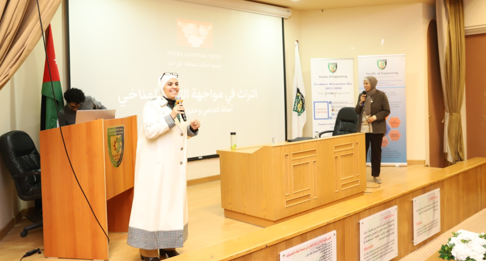 في إطار التعاون المتواصل بين جامعة البلقاء التطبيقية ومؤسسات المجتمع المحلي، نظّمت كلية الهندسة وبالتعاون مع الجمعية الوطنية للمحافظة على البترا ، والتي ترأسها سمو الأميرة دانا فراس ، محاضرة توعوية بعنوان: "أثر التغير المناخي على التراث الثقافي"، قدّمت لطلبة كلية الهندسة وطلبة قسم هندسة العمارة.