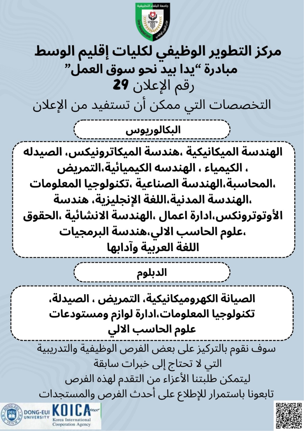 في خطوة جديدة نحو تعزيز جاهزية الطلبة والخريجين لسوق العمل، أعلن مركز التطوير الوظيفي في كليات إقليم الوسط بجامعة البلقاء التطبيقية عن إطلاق الدفعة التاسعة والعشرون من الفرص التدريبية والتوظيفية، ضمن مبادرة "يدًا بيد نحو سوق العمل".