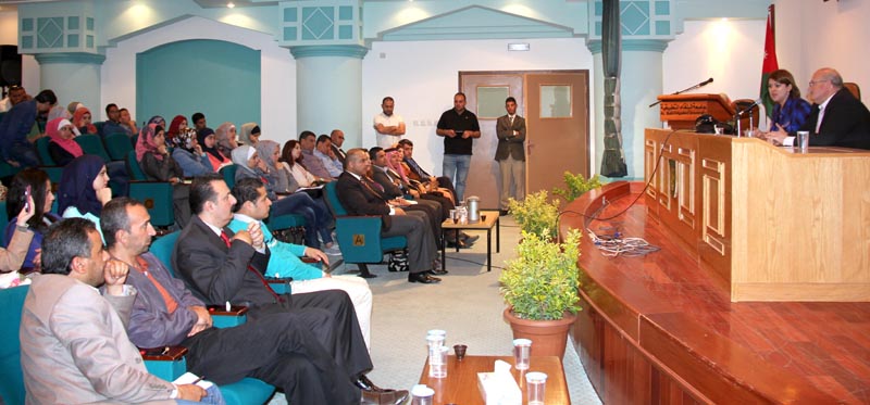 جاء ذلك ذلك خلال إفتتاحة للندوة التي عقدتها عمادة شؤون الطلبة بالجامعة بالتعاون مع منتدى أبناء البلقاء الثقافي , وإستضافت فيها النائب رولى الحروب ومدير المجلس الأعلى للشباب في محافظة البلقاء خالد أبوغنمي ؛ مبيناً مساوئ الفكر الإرهابي الذي يحمل مضامين الهدم للمبادئ والقيم الإنسانية و تكميم الأفواه وتجميد للعقول , ومصادرة للحريات و محاربة للإبداع و عدم قبول الأراء المعارضة , والتطاول على كرامة الإنسان وتوظيف الإسلام في مبادئ عنصرية لا تمثل المنطلقات الفكرية و السلوكية للديانات السماوية .