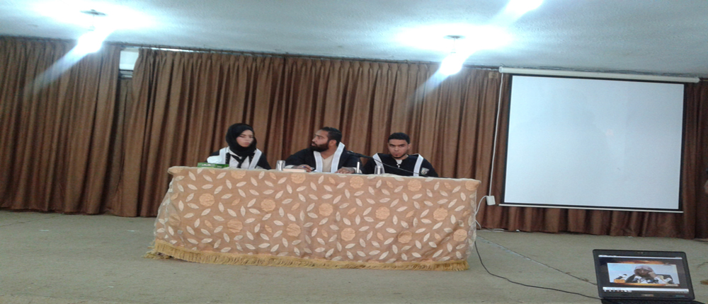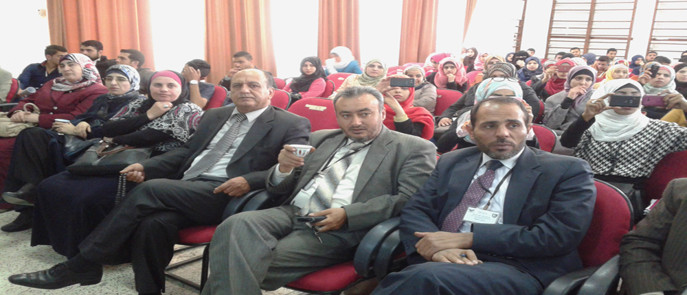 وقدم الدكتور علي القضاة عميد الكلية كلمة ترحيبية رحب فيها بالمشاركين وبالمدرسين بالقسم وأعضاء الهيئة الإدارية وطلاب الكلية وأضاف الدكتور علي القضاة ان الكلية تعمل جاهدة ومنذ تأسيسها على تنظيم هذه الفعالية كل عام بهدف إبراز الأنشطة العلمية للطلبة وربطهم بالمجتمع المحلي. وفي بداية اليوم العلمي قدم طلبة القسم عرض مسرحي باشراف الدكتورة أمل العمري يعكس فكرة تخلي ابناء اللغة العربية عنها وهي محاكاة لأهل اللغة يدافع عنها محام يعكس شخصيا الضعف اللغوي عند اهل اللغة .