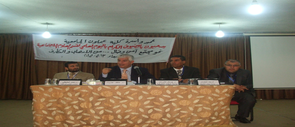 برعاية عميد كلية عجلون الجامعية الدكتور علي القضاة بدأت فعاليات اليوم العلمي لقسم العلوم الاجتماعية في كلية عجلون الجامعية/جامعة البلقاء التطبيقية تحت عنوان (نحو مجتمع آمن خال من التطرف والارهاب )