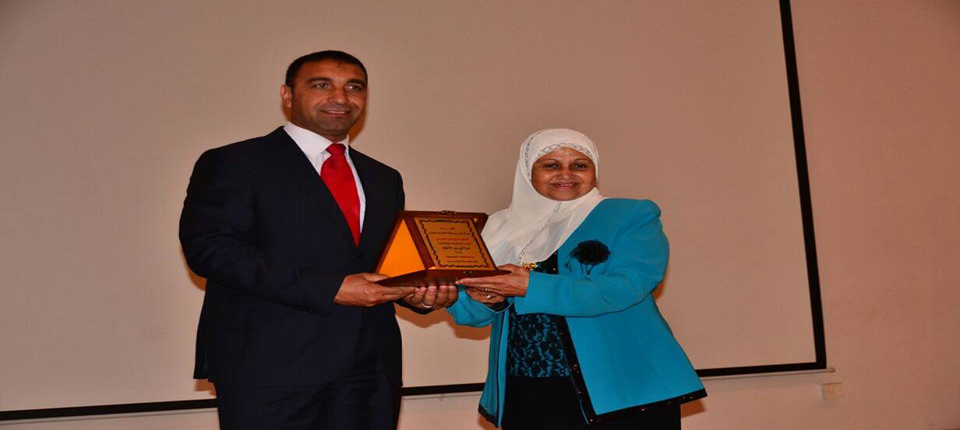 وفي نهاية الندوة قامت معالي الوزيرة بتكريم إحدى الموظفات المتقاعدات من الكلية على الجهود التي قدمتها أثناء الخدمة .