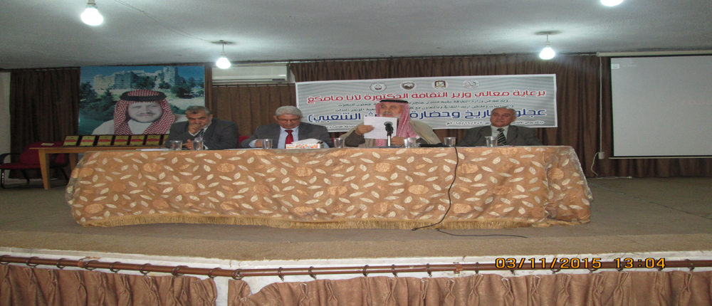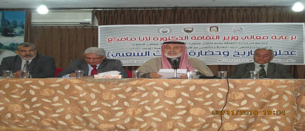 برعاية الأمين العام لوزارة الثقافة مأمون التلهوني و مندوباً عن وزيرة الثقافة الدكتورة لانا مامكغ وبحضور مدير ثقافة عجلون السيد سامر الفريحات وعميد كلية عجلون الجامعية الدكتور علي القضاة بدأت فعاليات المؤتمرالثالث عجلون تاريخ وحضارة ( التراث الشعبي في عجلون ) وعلى مدار يومين في رحاب كلية عجلون الجامعية/جامعة البلقاء التطبيقية والذي ينظمه منتدى عنجرة الثقافي وجمعية عجلون للبحوث والدراسات وملتقى إربد الثقافي.