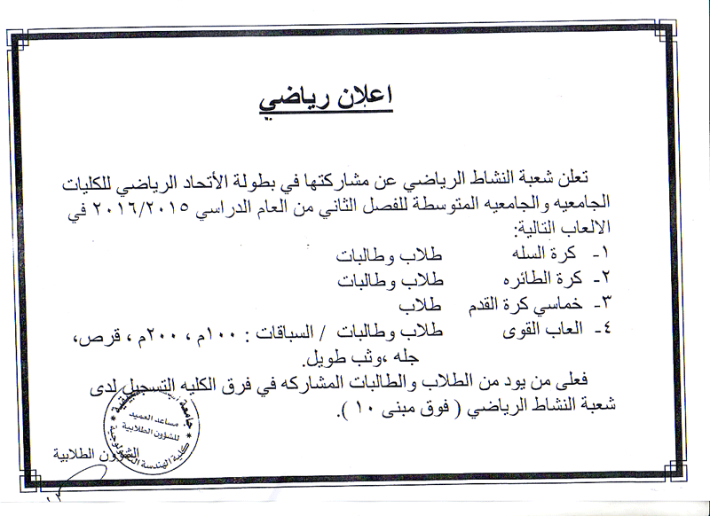 اعلان صادر عن شعبة النشاط الرياضي