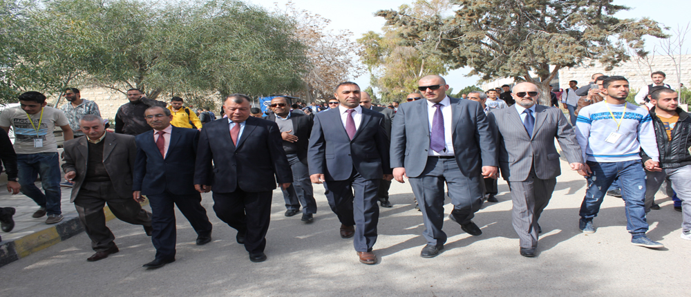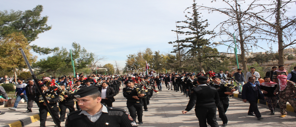 وقد انطلقت مسيرة ضخمة شارك فيها الالاف من الطلبة واعضاء الهيئتين التدريسية والادارية جابت انحاء الكلية على انغام الاغاني الوطنية التي عزفتها موسيقات قوات الدرك واحاطت بالمسيرة خيول الامن العام .