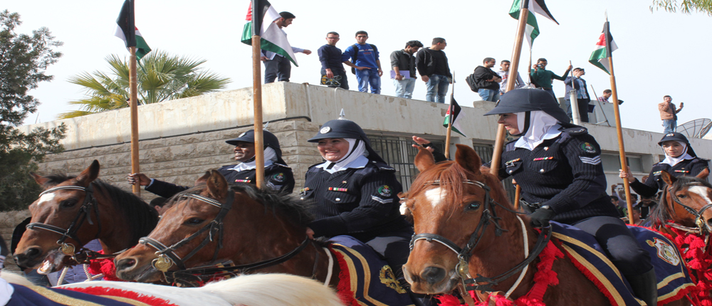 حيث ابتدأ الاحتفال بالسلام الملكي بمرافقة موسيقات قوات الدرك ورفع علم الثورة العربية الكبرى بمشاركة مجموعة من فرسان وفارسات الامن العام .