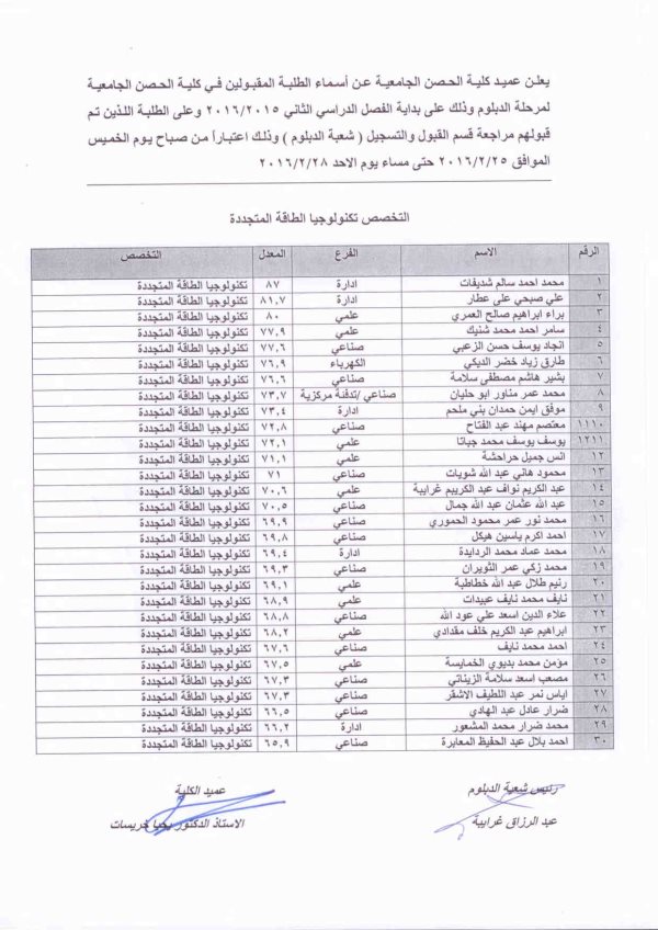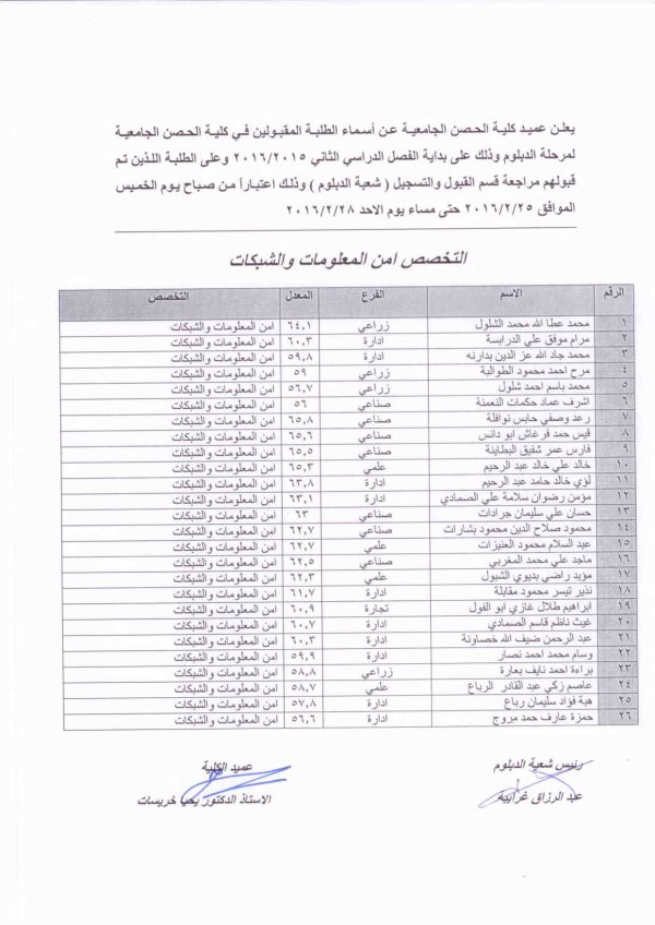 يعلن عميد كلية الحصن الجامعية عن اسماء الطلية القبولين في كلية الحن الجامعية لمرحلة الدبلوم و ذلك عن بداية الفصل الدراسي الثاني 2015/2016 و على الطلبة اللذين تم قبولهم مراجعة قسم القبول و التسجيل اعتبارا من صباح يوم الخميس الموافق 25/2/2016و حتى مساء يوم الاحد الموافق 28/2/2016
