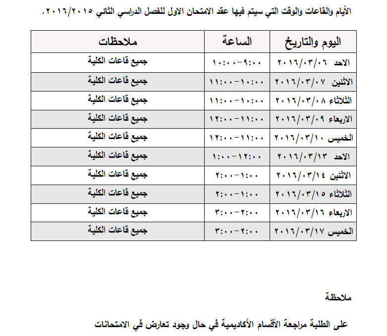 الأيام والقاعات والوقت التي سيتم فيها عقد الامتحان الاول للفصل الدراسي الثاني 2015/2016 كلية الهندسة التكنولوجية