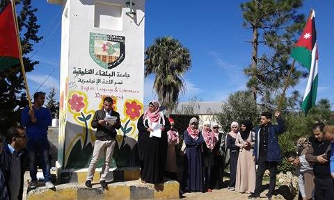 نفذت اسرة كلية عجلون الجامعية / جامعة البلقاء التطبيقية اليوم وقفة تضامنية من اجل الشهيد البطل راشد الزيود وضد الارهاب بمشاركة من عميد الكلية الدكتور علي القضاة ونائب العميد الدكتور فيصل مطالقه ومساعدي العميد واعضاء الهيئتين الاكاديمية والادارية وطلبة الكلية