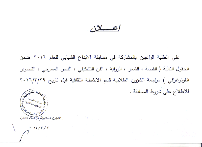 اعلانات قسم الشؤون الطلابية كلية الهندسة التكنولوجية