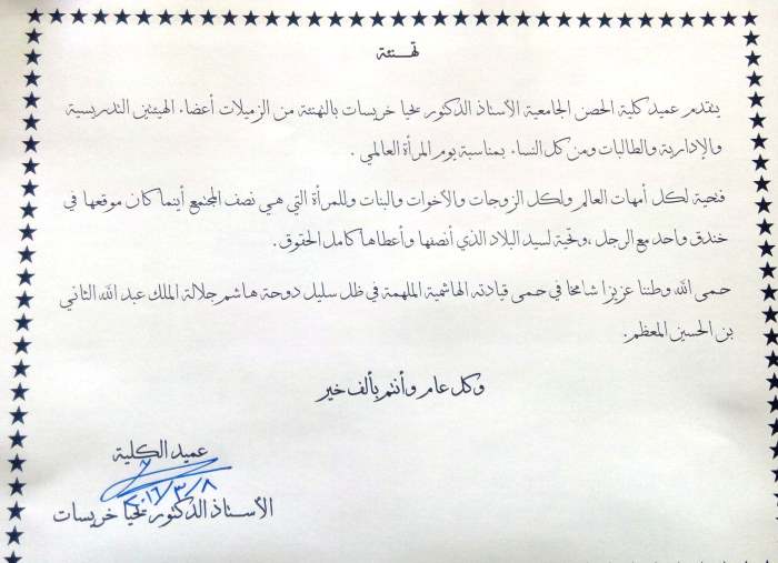فتحية لكل أمهات العالم ولكل الزوجات والأخوات والبنات وللمرأة التي هي نصف المجتمع أينما كان موقعها في خندق واحد مع الرجل ،وتحية لسيد البلاد الذي أنصفها وأعطاها كامل الحقوق