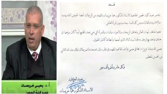يتقدم عميد كلية الحصن الجامعية الأستاذ الدكتور يحيا خريسات بالتهنئة من الزميلات أعضاء الهيئتين التدريسية والإدارية والطالبات ومن كل النساء بـمناسبة يوم المرأة العالمي