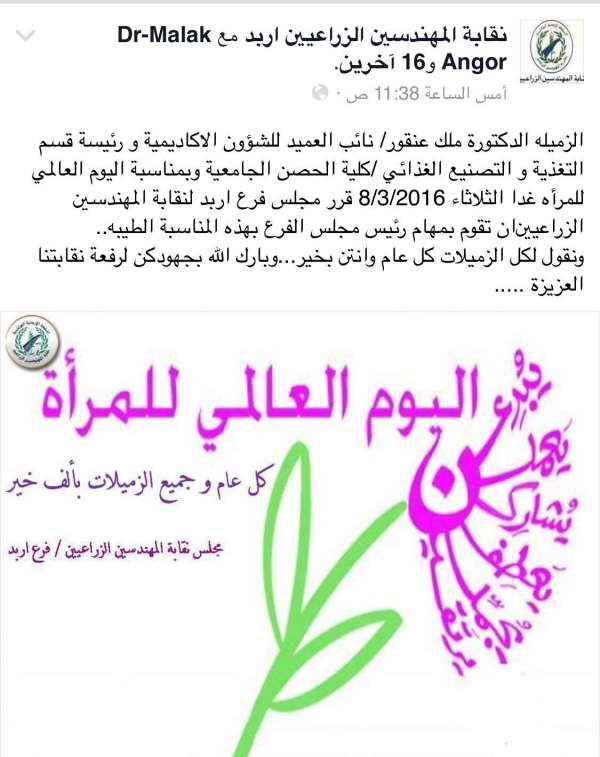 كرم مجلس نقابة المهندسيين الزراعيين/اربد بمناسية يوم المرأة العالمي الدكتورة ملك عنقور نائب عميد كلية الحصن الجامعية ورئيسة قسم التغذية والتصنيع الغذائي باختيارها رئيسة فخرية لمجلس فرع اربد/نقابة المهندسيين الزراعيين