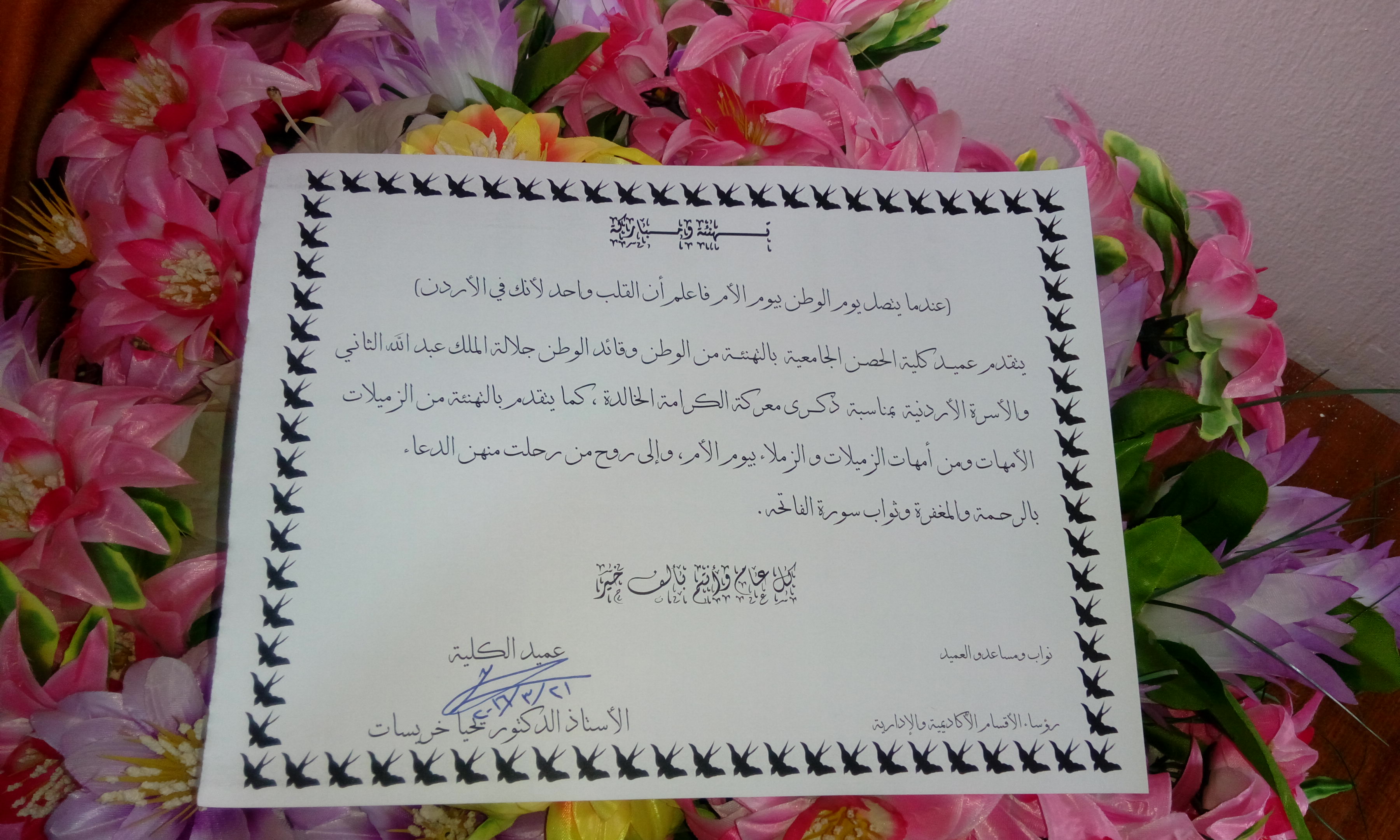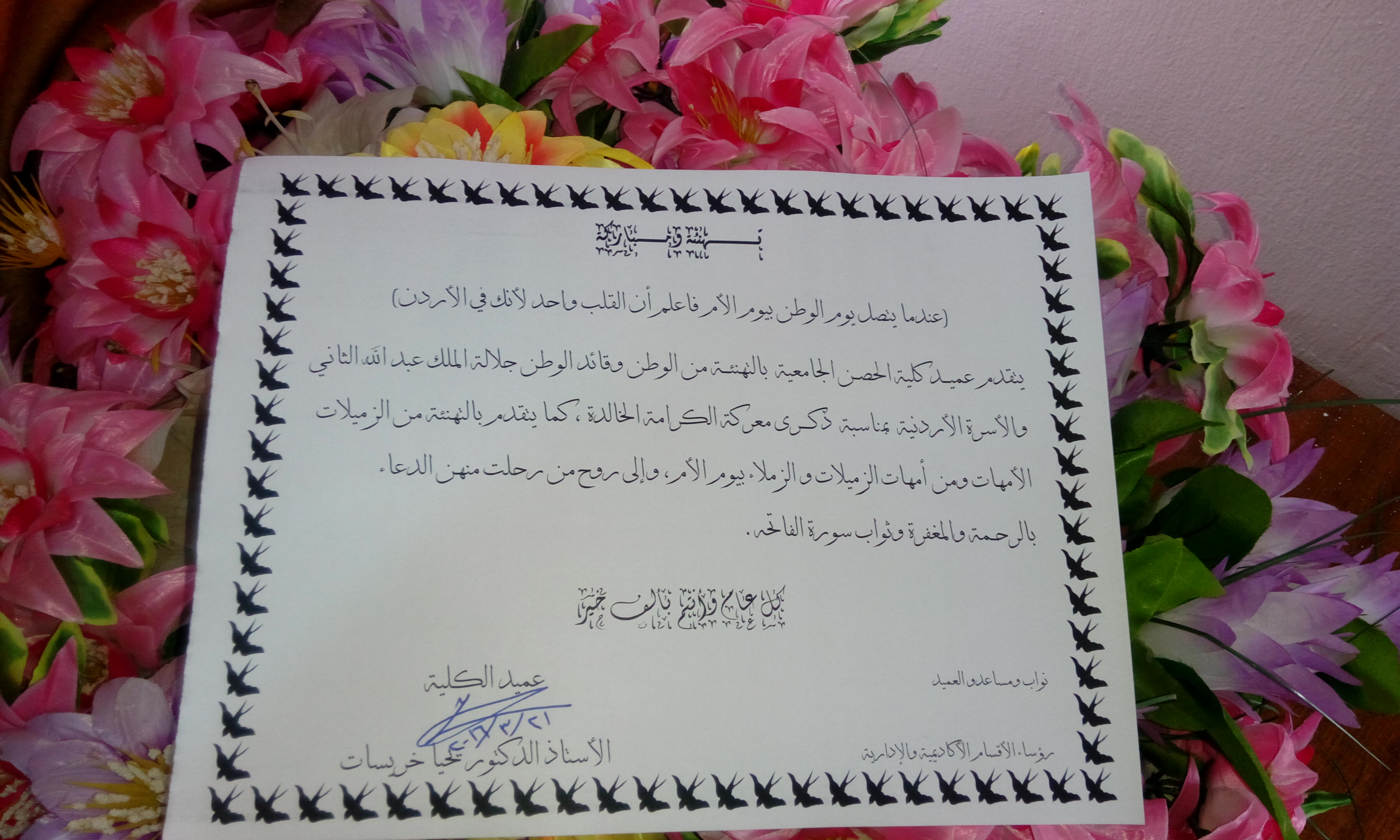 يتقدم عميـــد كلية الحصــن الجامعية بالتهنئـــة من الوطن وقائد الوطن جلالة الملك عبد الله الثاني والأسرة الأردنية بمناسبة ذكـــــرى معركة الكرامة الخالدة ، كما يتقدم بالتهنئة من الزميلات الأمهات ومن أمهات الزميلات و الزملاء بيوم الأم، وإلى روح من رحلت منهن الدعاء بالرحــمة والمغفرة وثواب سورة الفاتحه.