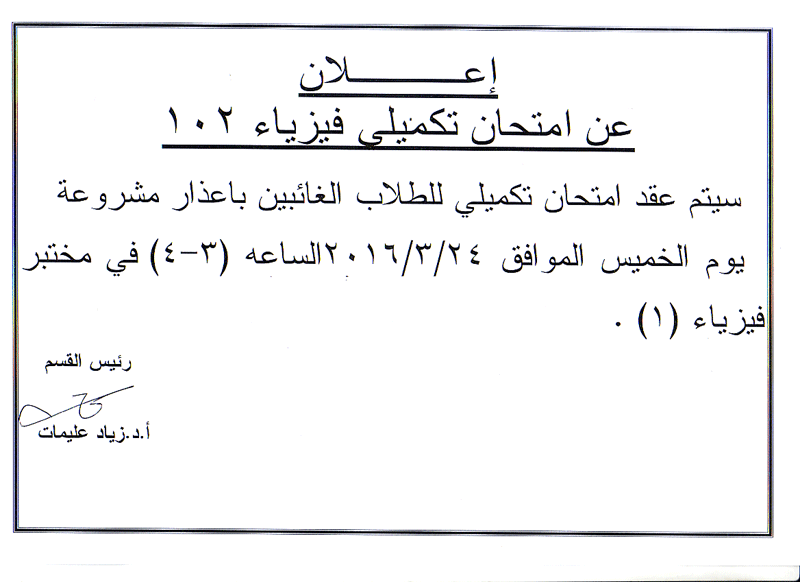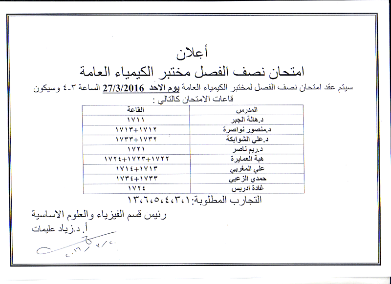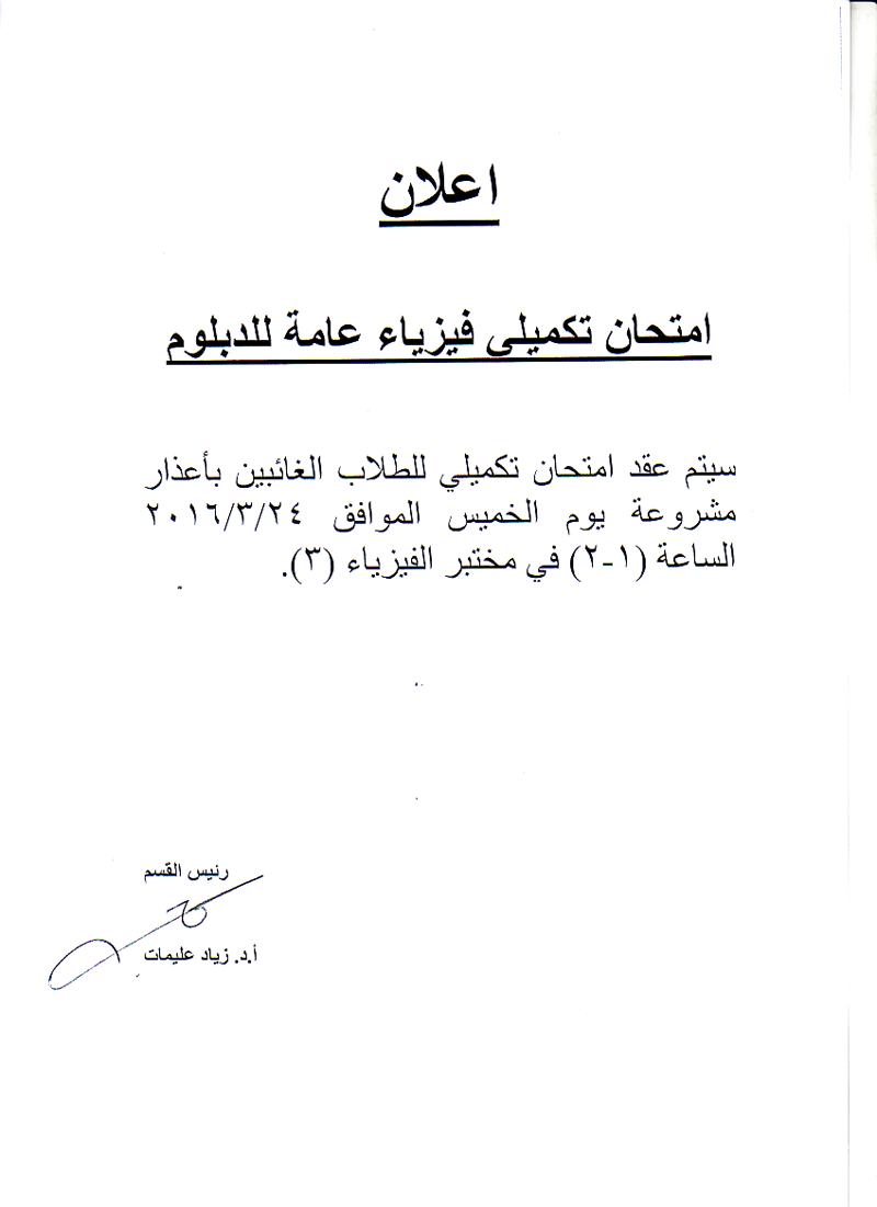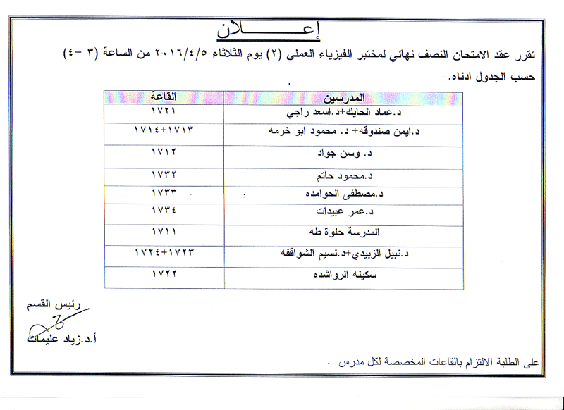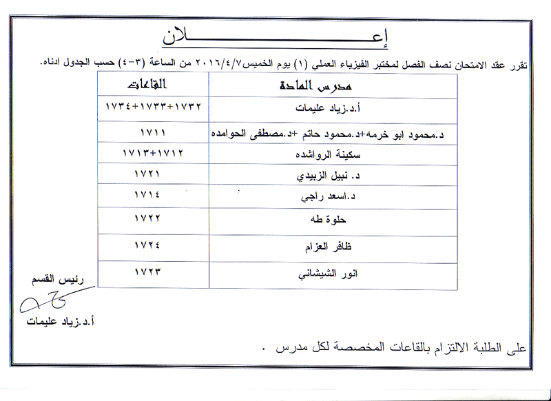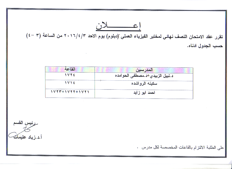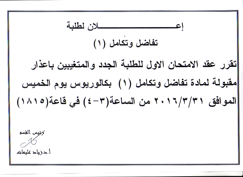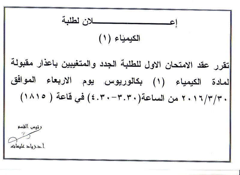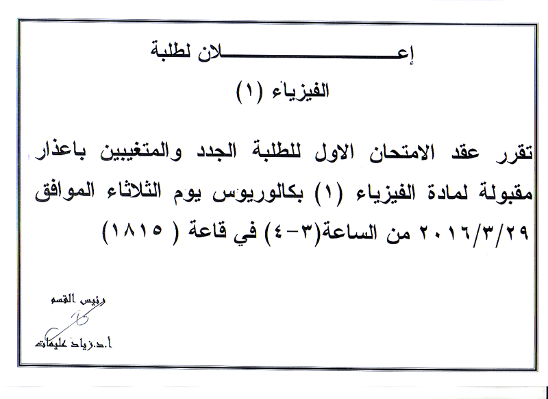 اعلانات صادرة عن قسم العلوم التطبيقية خاص بطلبة كلية الهندسة التكنولوجية