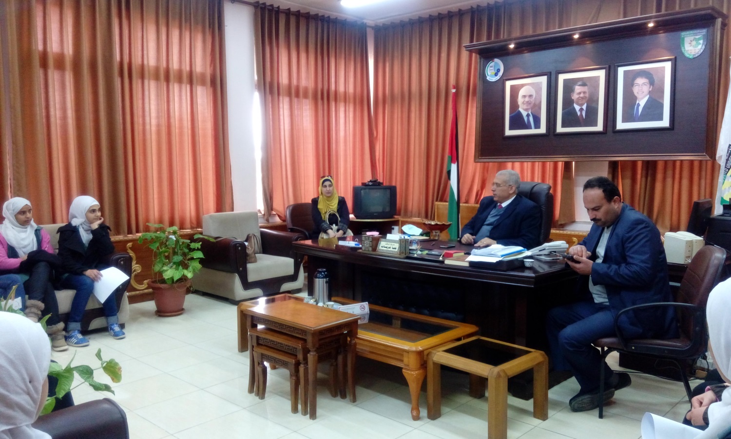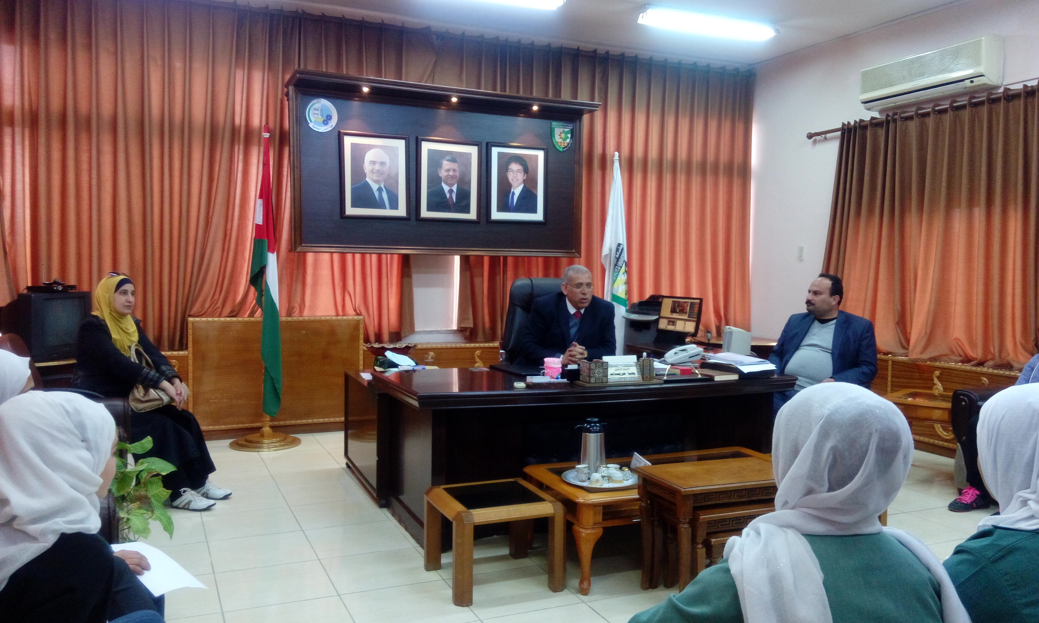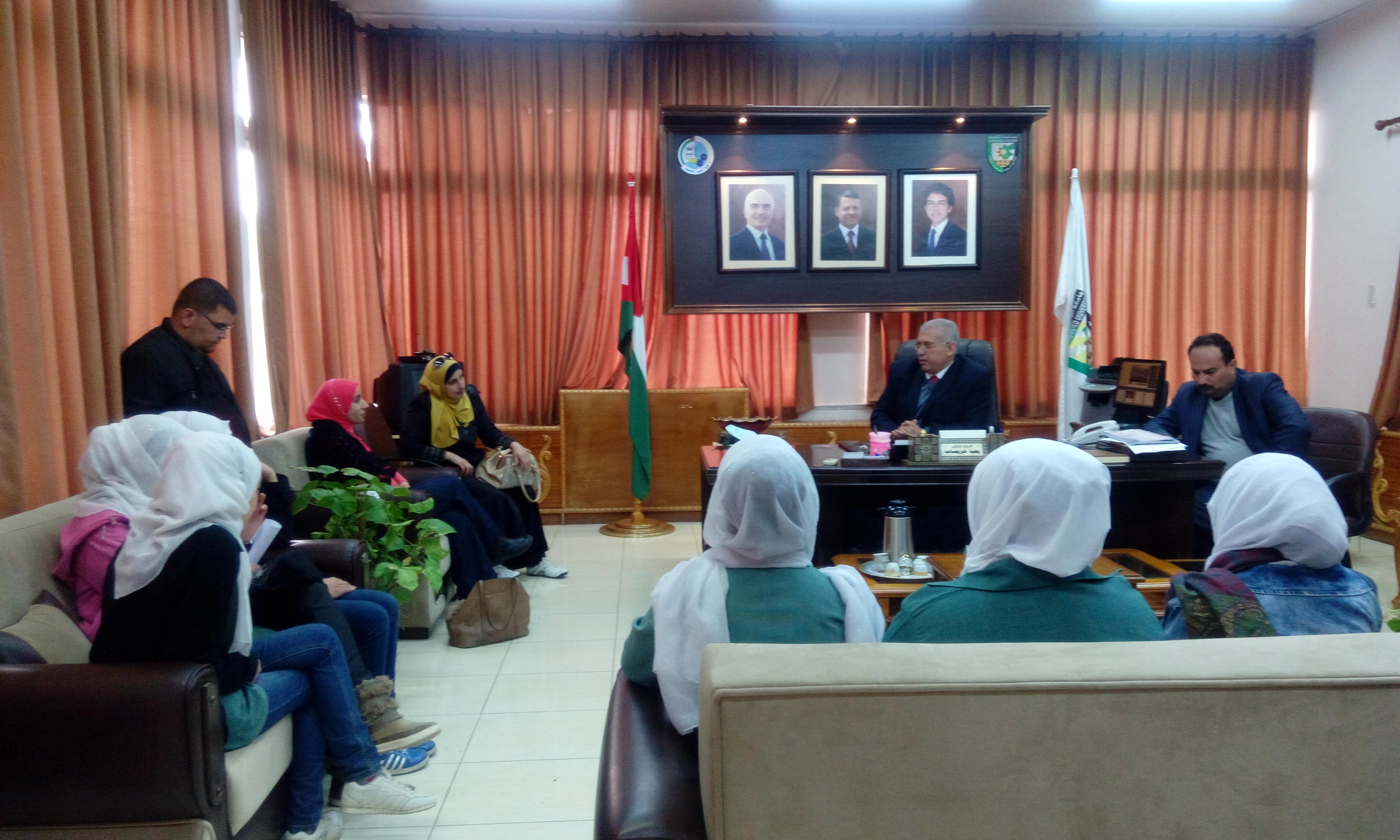 استقبل الأستاذ الدكتور يحيا خريسات عميد كلية الحصن الجامعية في مكتبه وفدا من الطالبات المتميزات في الصف العاشر من طالبات مدرسة الحصن الأساسية المختلطة حيث جاءت الزيارة بتنسيق ومتابعه حثيثة من مديرة المدرسة المربية الفاضلة لانا الحوراني وبإشراف مدرستين من المدرسة هما الآنسة إيمان الأحمد والآنسة ختام الصقر حيث جاءت الزيارة بهدف اطلاع الطالبات على المختبرات والمشاغل في الكلية.