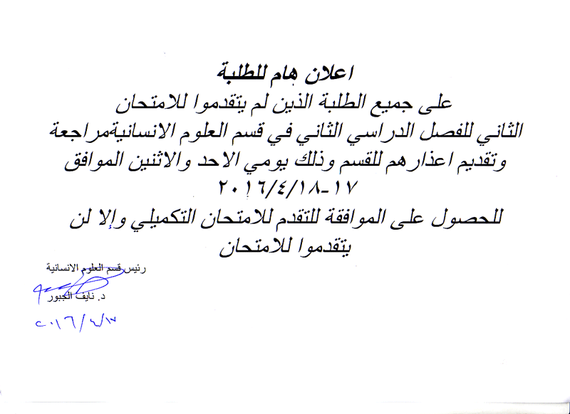 اعلان هام للطلبة الذين لم يتقدموا للامتحان الثاني قسم العلوم الانسانية