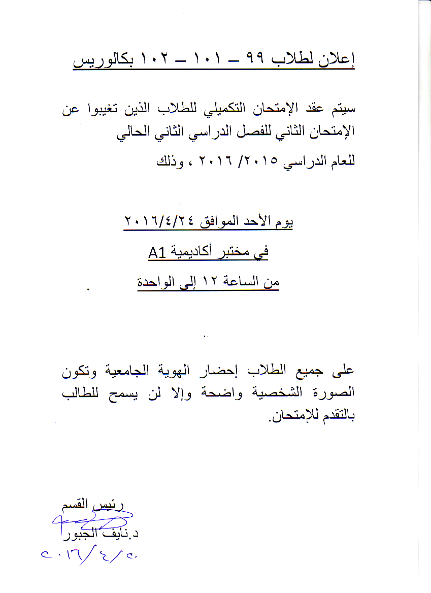 اعلان لطلاب انجليزي 99-101-102 بكالوريوس كلية الهندسة التكنولوجية
