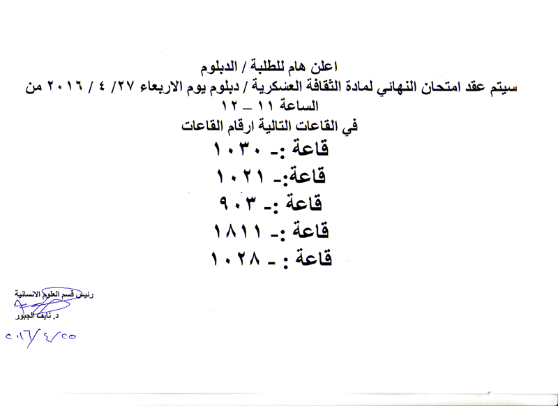 اعلان هام لطلبة الدبلوم كلية الهندسة التكنولوجية الامتحان النهائي لمادة الثقافة العسكرية