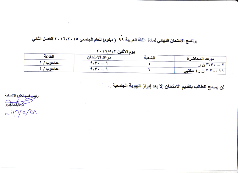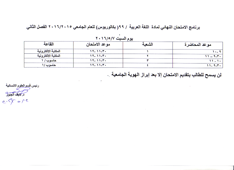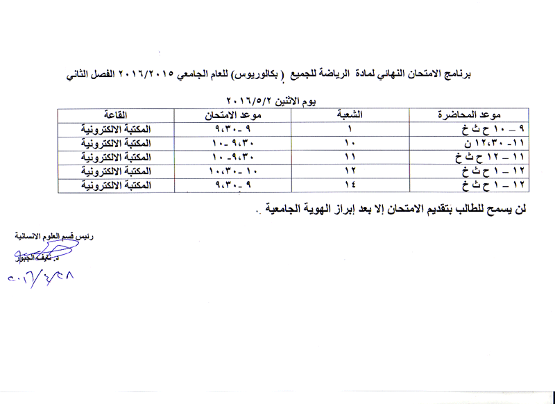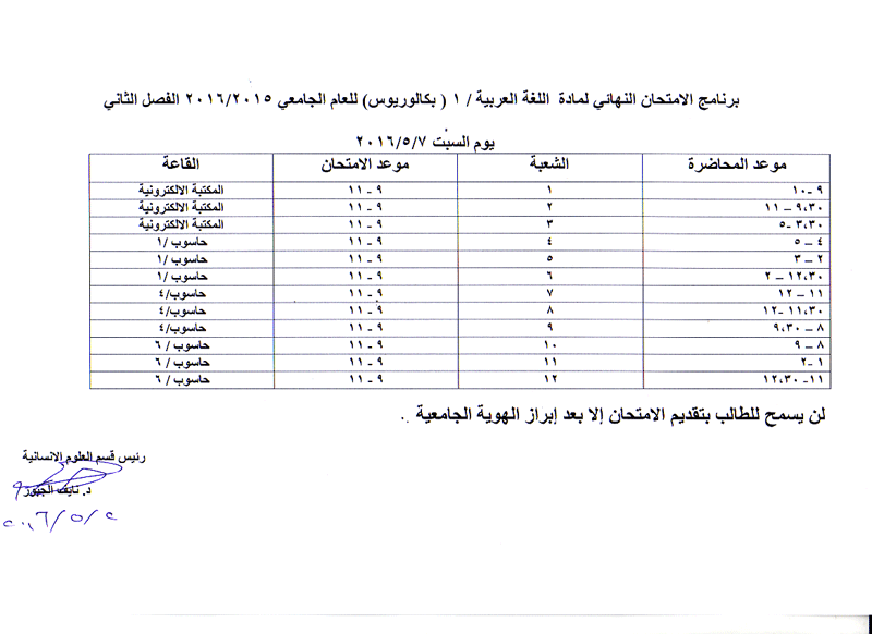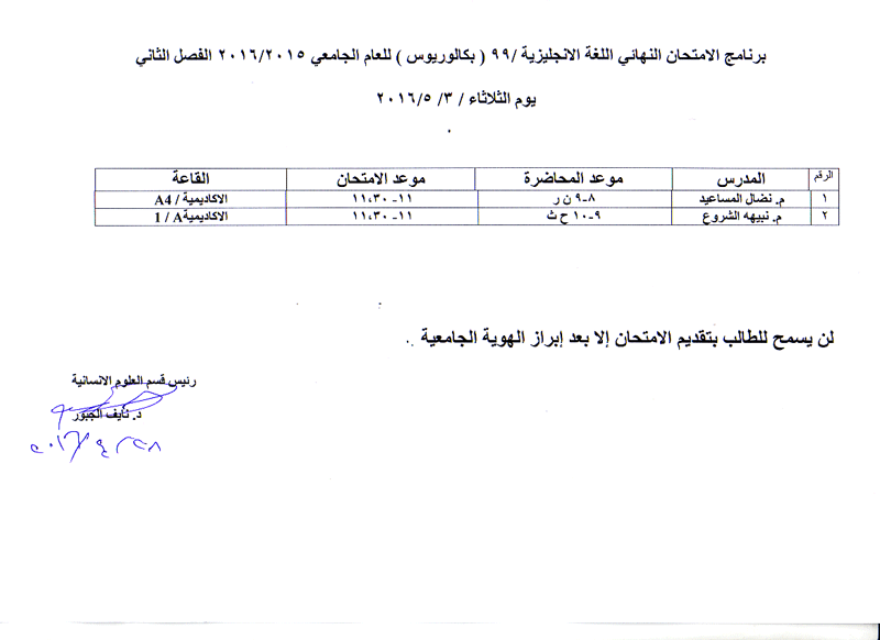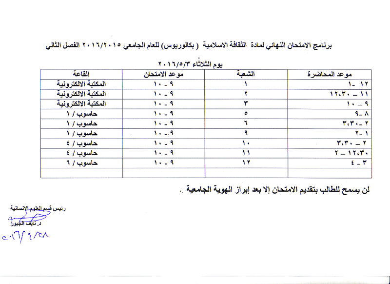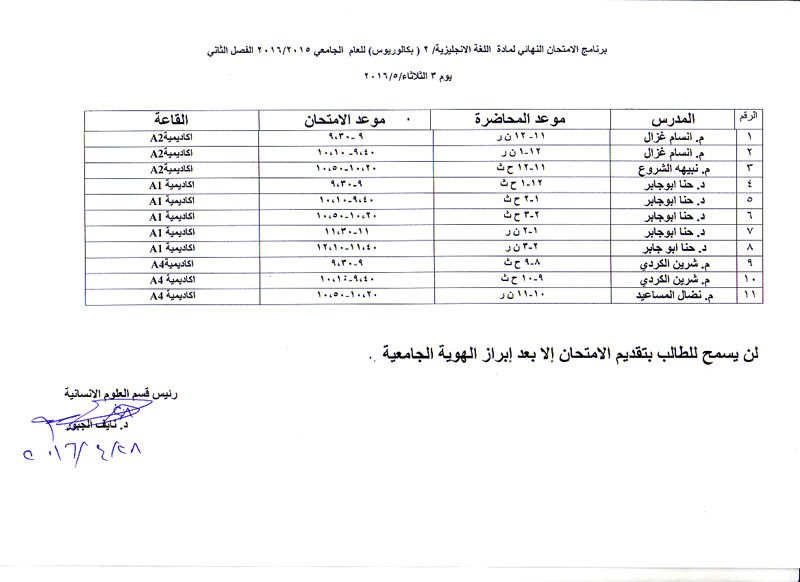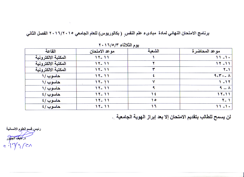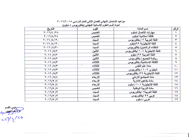 مواعيد الامتحان النهائي للفصل الثاني لمواد قسم العلوم الانسانية