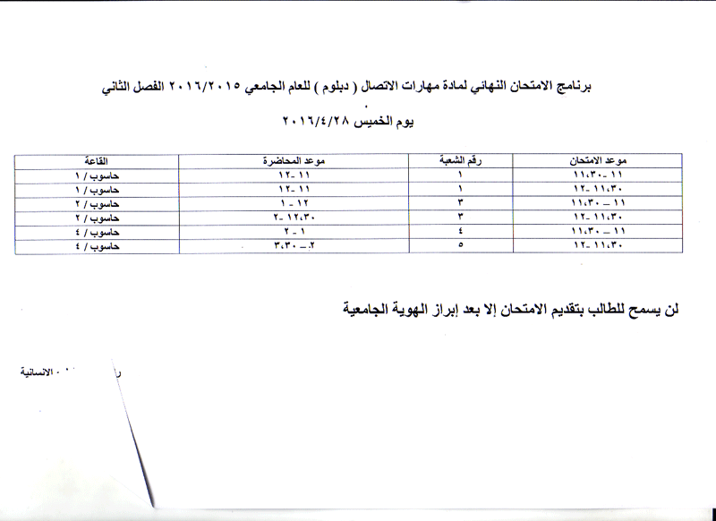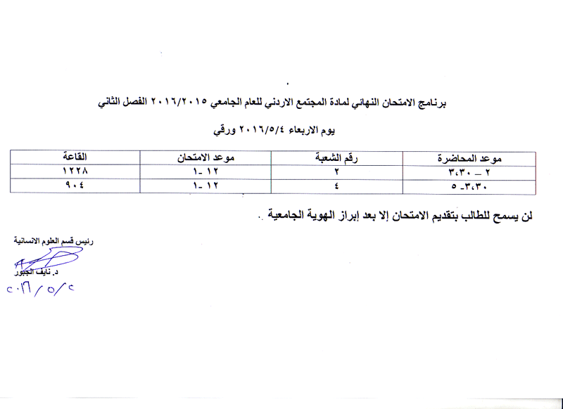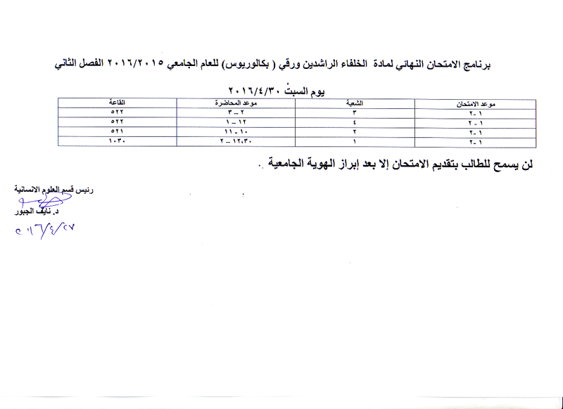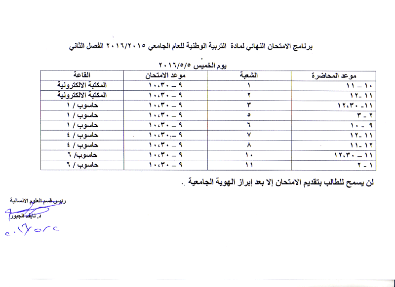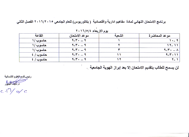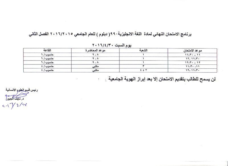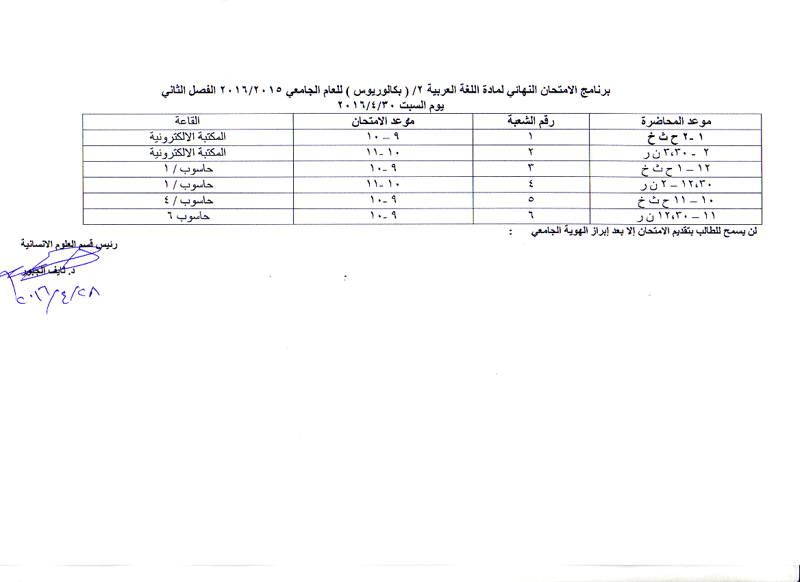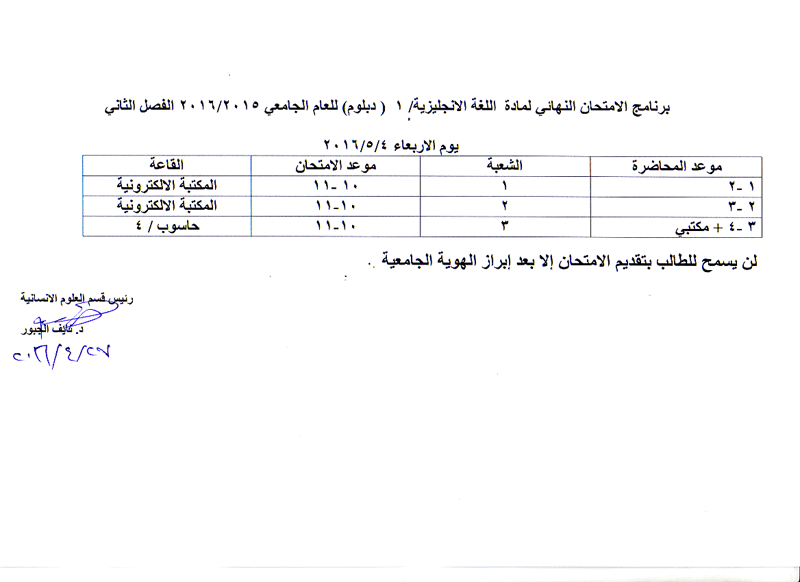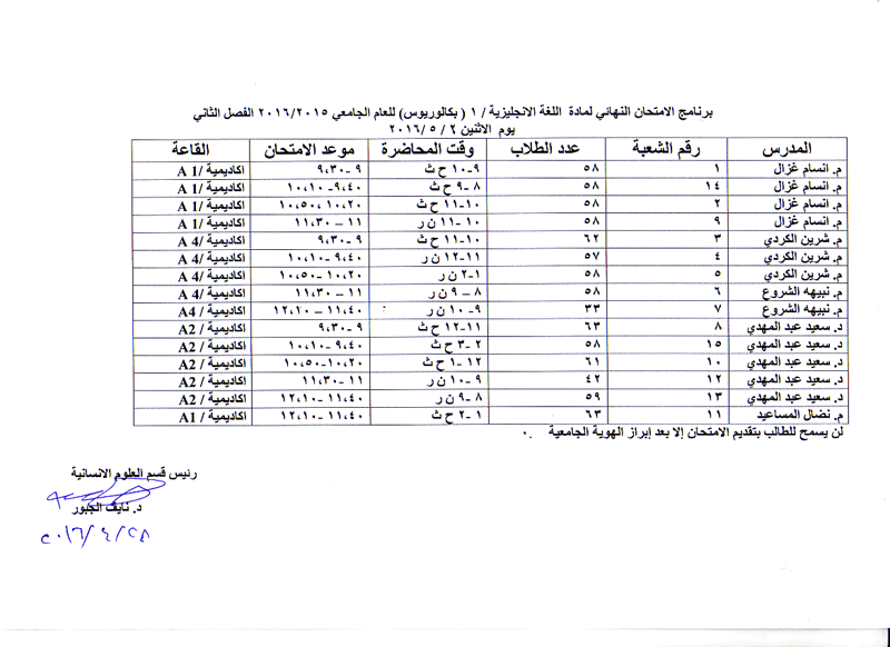 مواعيد الامتحان النهائي للفصل الثاني لمواد قسم العلوم الانسانية