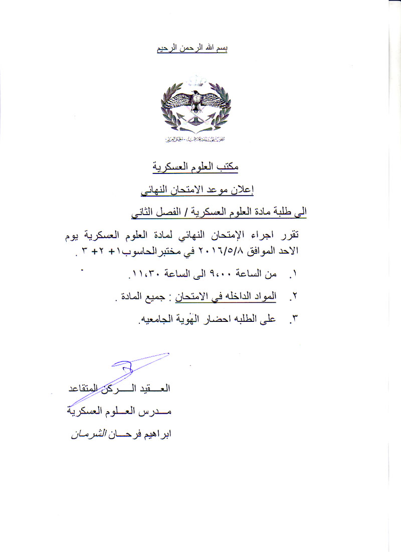 اعلان موعد الامتحان النهائي الى طلبة مادة العلوم العسكرية / الفصل الثاني راجع المرفق