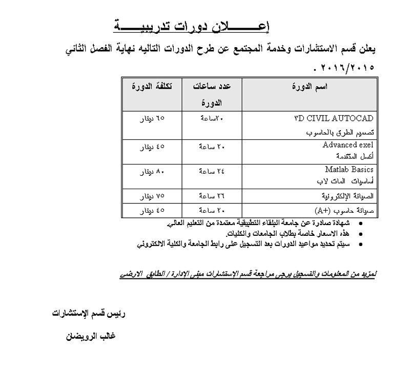 إعـــلان دورات تدريبيــة كلية الهندسة التكنولوجية