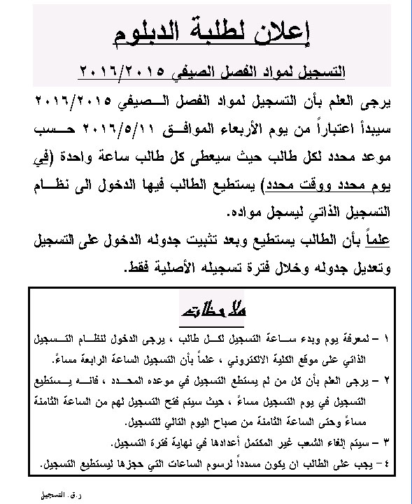 إعلان لطلبة الدبلوم التسجيل لمواد الفصل الصيفي 2015/2016 كلية الهندسة التكنولوجية