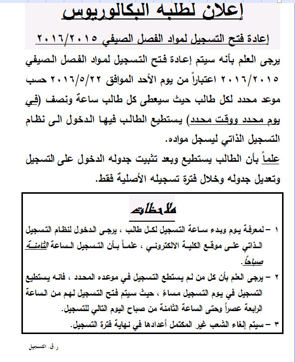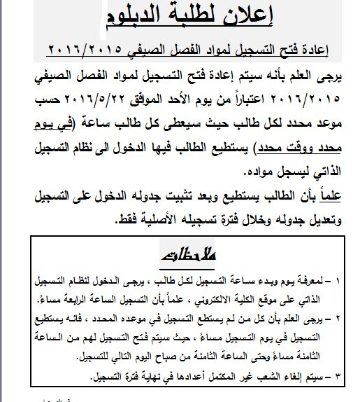 اعلان لطلبة البكالوريوس و الدبلوم إعادة فتح التسجيل لمواد الفصل الصيفي 2015/2016 كلية الهندسة التكنولوجية