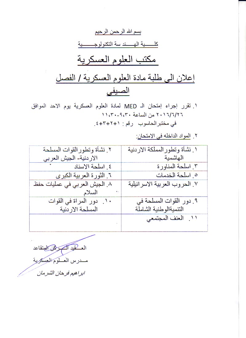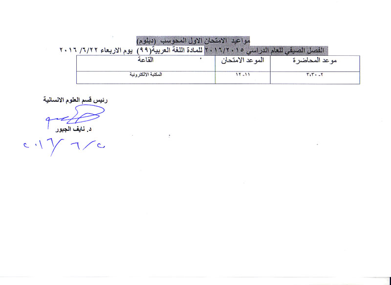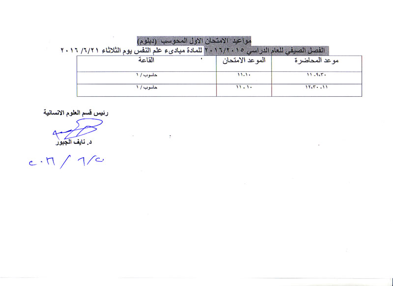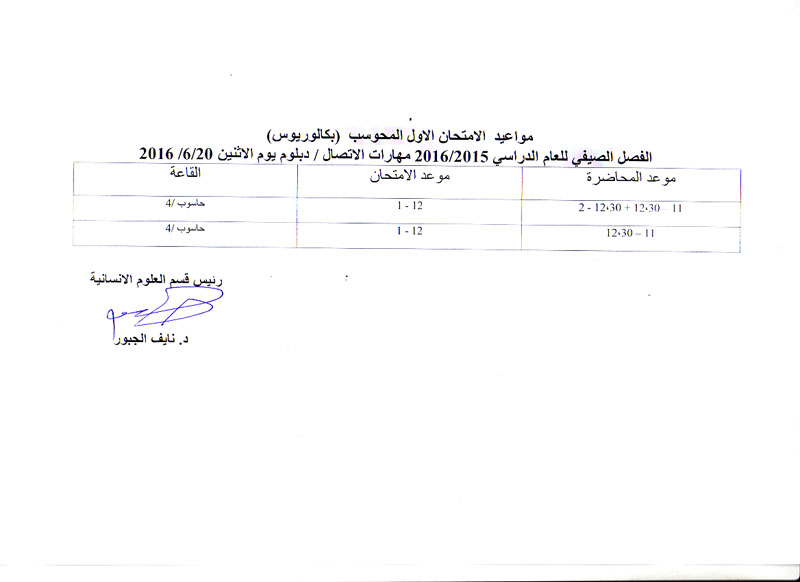 مواعيد الامتحان الاول المحوسب بكالوريوس و دبلوم قسم العلوم الانسانية للفصل الصيفي 2015-2016