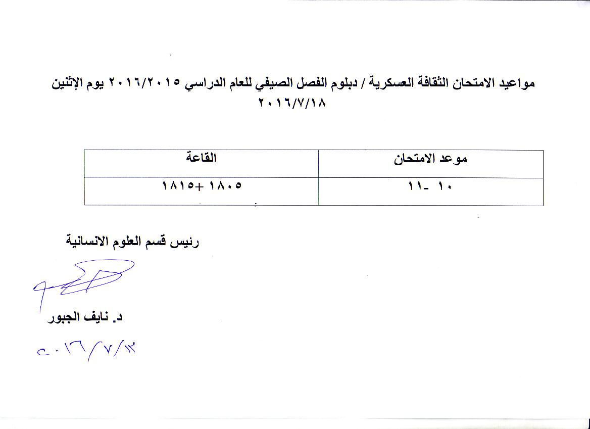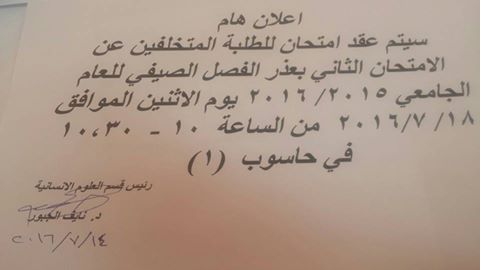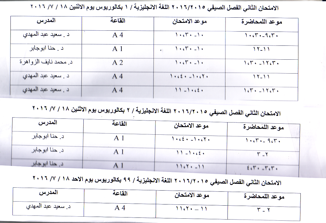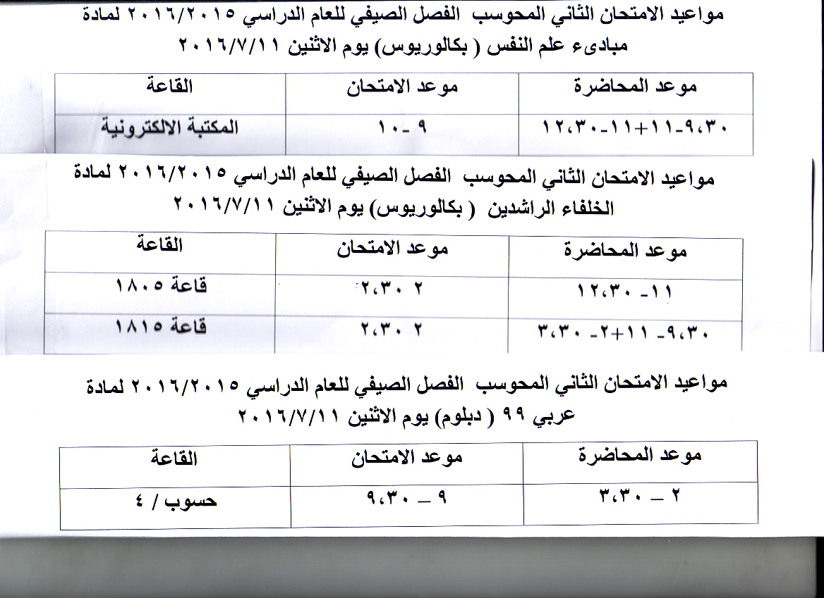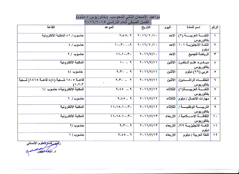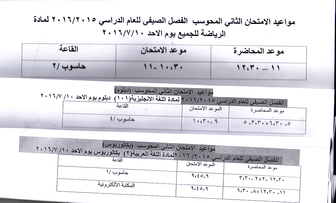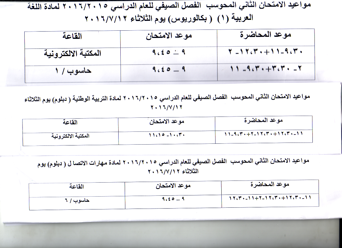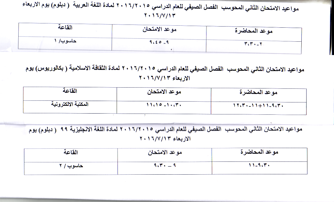 مواعيد الامتحان الثاني المحوسب بكالوريوس و دبلوم الفصل الصيفي للعام الدراسي 2016/2015 قسم العلوم الانسانية كلية الهندسة التكنولوجية