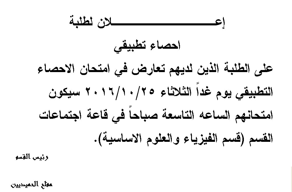 اعلان هام لطلبة احصاء تطبيقي كلية الهندسة التكنولوجية