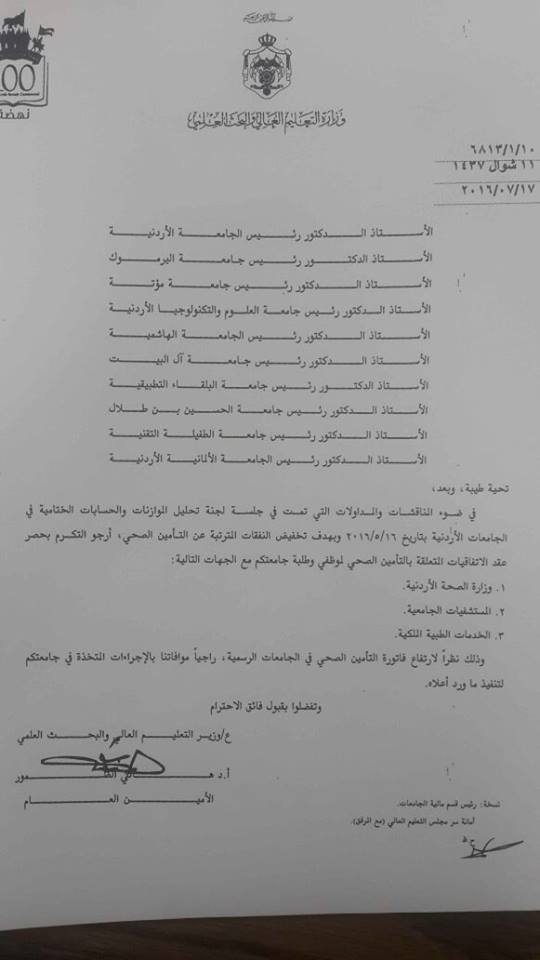 إن القرار الصادر من مجلس الجامعة و الذي تضمن هيكلة التأمين الصحي في الجامعة هو قرار جاء ضمن أسس و أطر تكفل لنا كموظفين الحصول على خدمات طبية و علاجية متميزة , و إننا نعلن تأييدنا لهذا القرار, و كما أننا نقف خلف رئاسة جامعتنا الموقرة لتنفيذ ما جاء بها تلبية لطموحات أبناء الجامعة التي هي بحجم طموحات الوطن و قيادته .