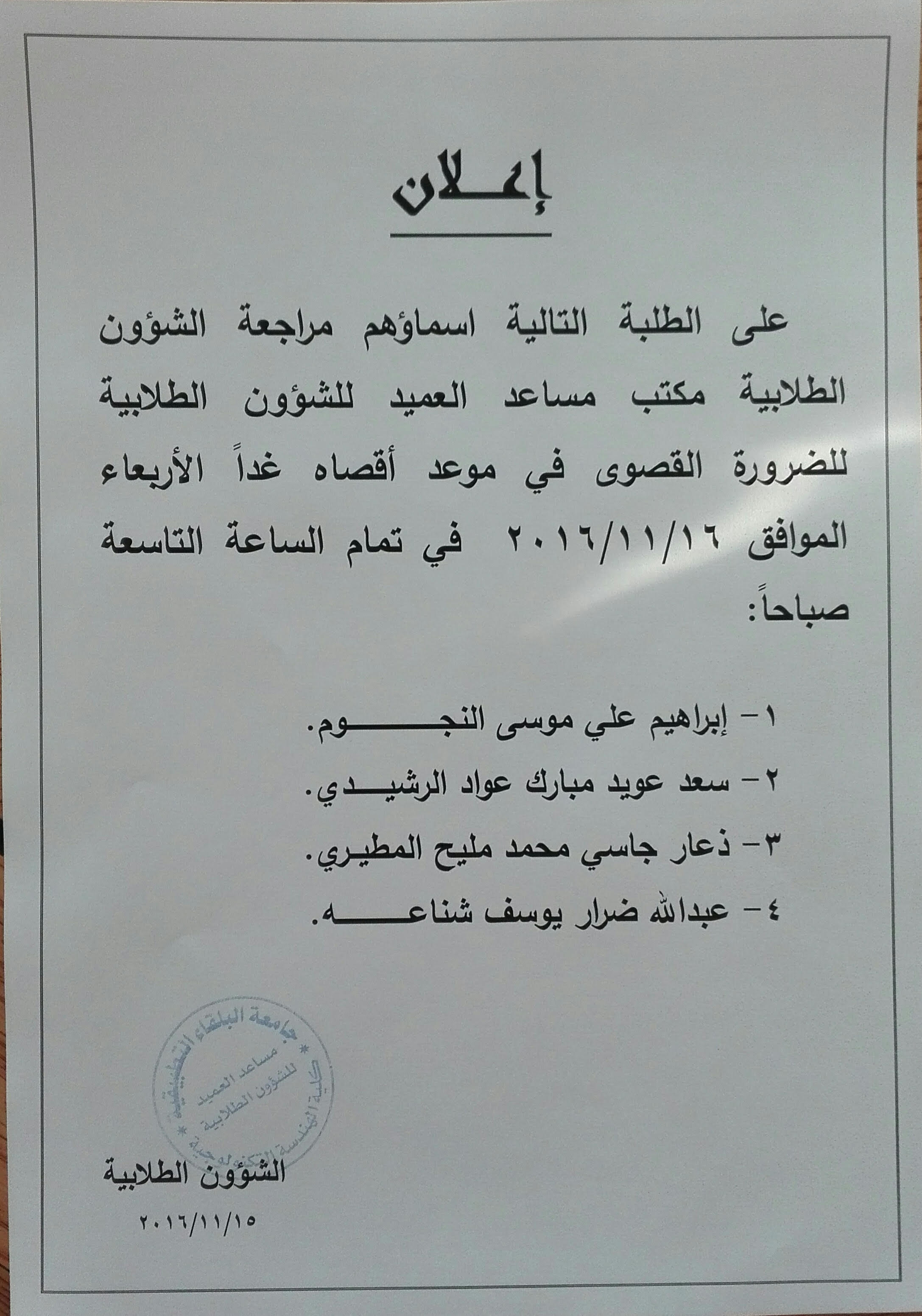 اعلان هام صادر عن قسم الشؤون الطلابية كلية الهندسة التكنولوجية