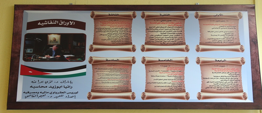 ضمن مساق التربية الوطنية قامت الطالبتان رانيا ابو زيد و لوريس العقرباوي بتصميم لوحة تعريفية بالاوراق النقاشية لجلالة الملك عبدالله الثاني ابن الحسين حفظه الله ورعاه ، ويأتي هذا النشاط ضمن تفاعل الطلبة مع الاوراق النقاشية الملكية بإعتبارها نبراس ومشعل هداية للطلبة واعضاء هيئة التدريس والهيئة الادارية في جامعة البلقاء التطبيقية .