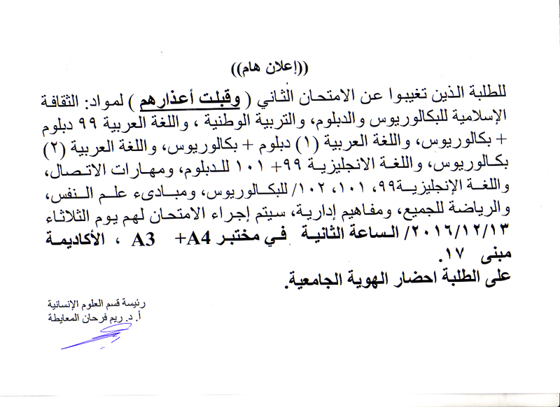 اعلان هام للطلبة الذين تغيبوا عن الامتحان الثاني وقبلت اعذارهم قسم العلوم الانسانية