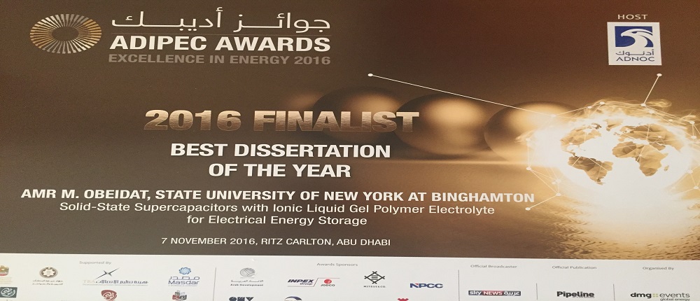 جائزة أفضل أطروحة قدمت إلى جامعة بنجامتن / نيويورك الأمريكية للحصول على درجة الدكتوراه في الهندسة الكهربائية للعام الجامعي 2016/2017 مع التركيز على الطاقة المتجددة وذلك من قبل مؤسسة ADIPEC الدولية لبحوث الطاقة الذكية.