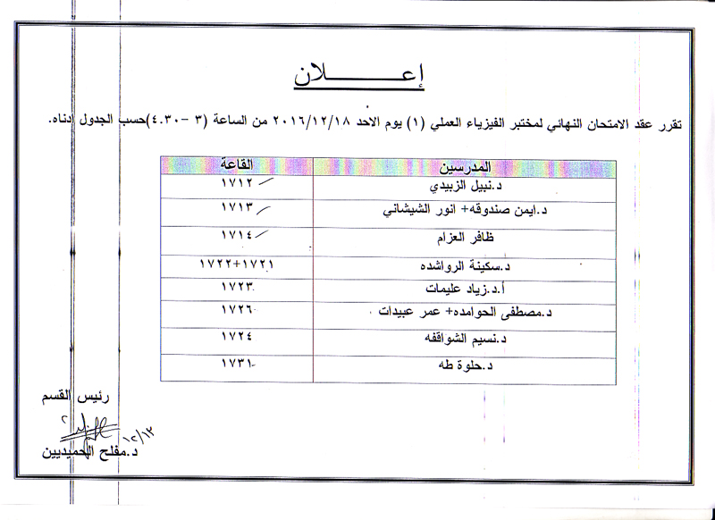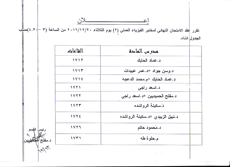 اعلان صادر عن قسم الفيزياء والعلوم الاساسية كلية الهندسة التكنولوجية