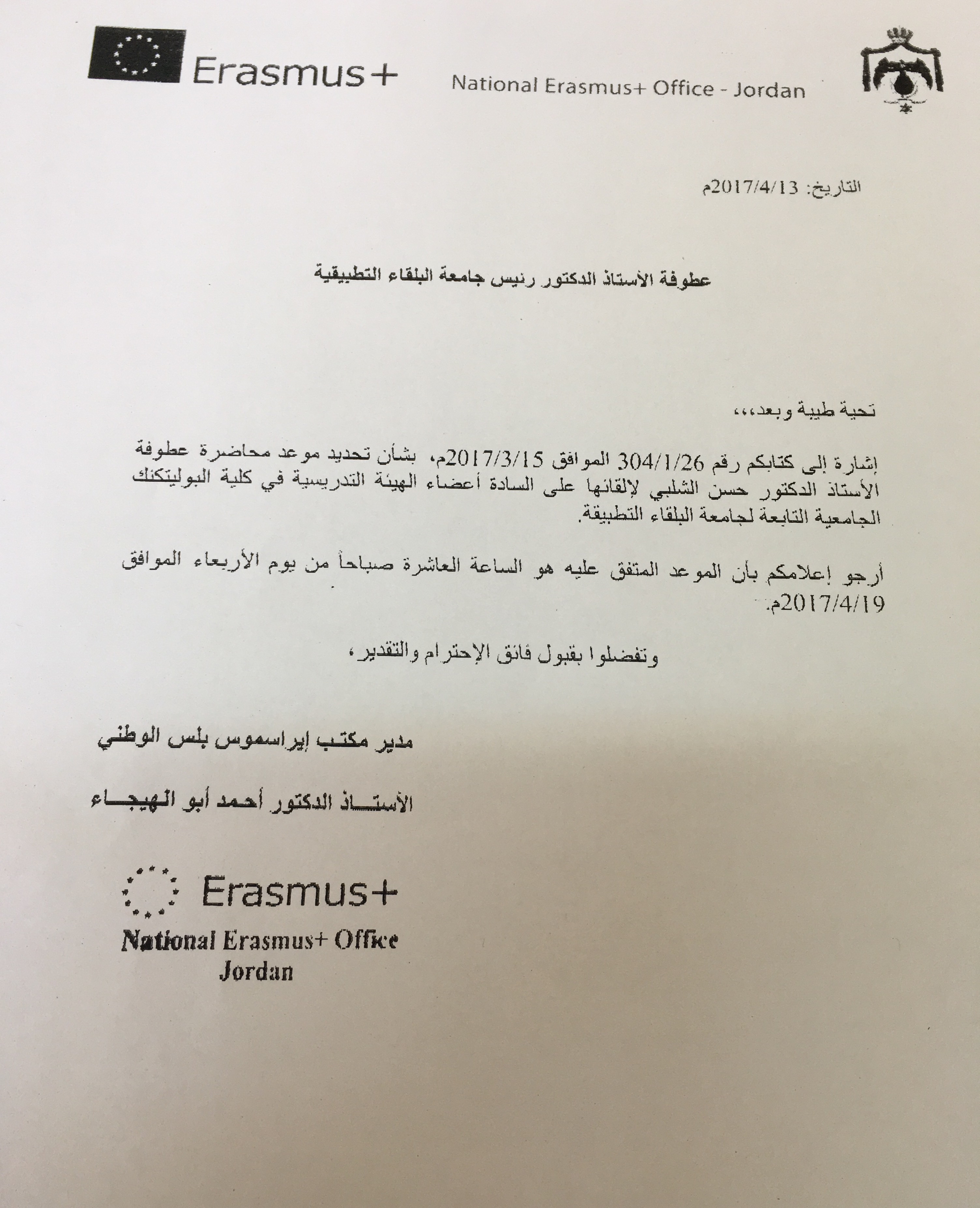 مرفق اعلان موعد محاضرة ايراسموس بلس و التي سوف تعقد في كلية الهندسة التكنولوجية - عمان يوم الاربعاء 19-4-2017 الساعة العاشرة صباحا