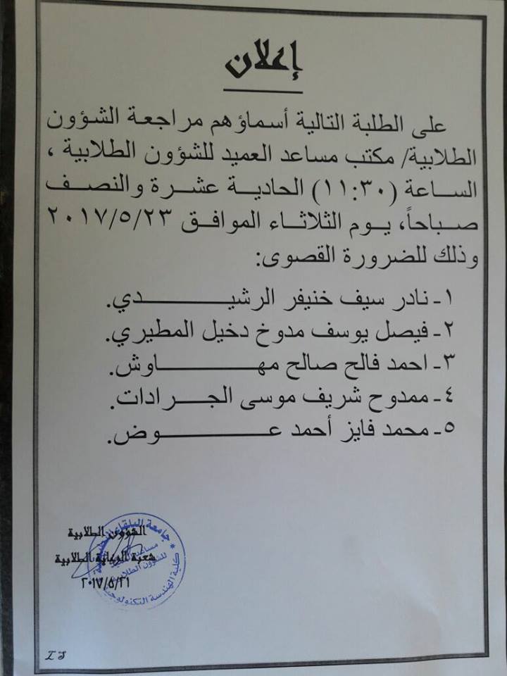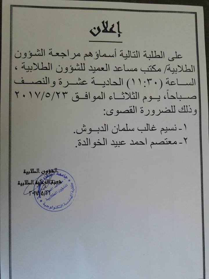 اعلان صادر عن الشؤون الطلابية