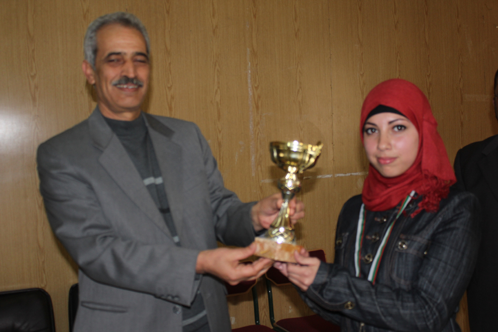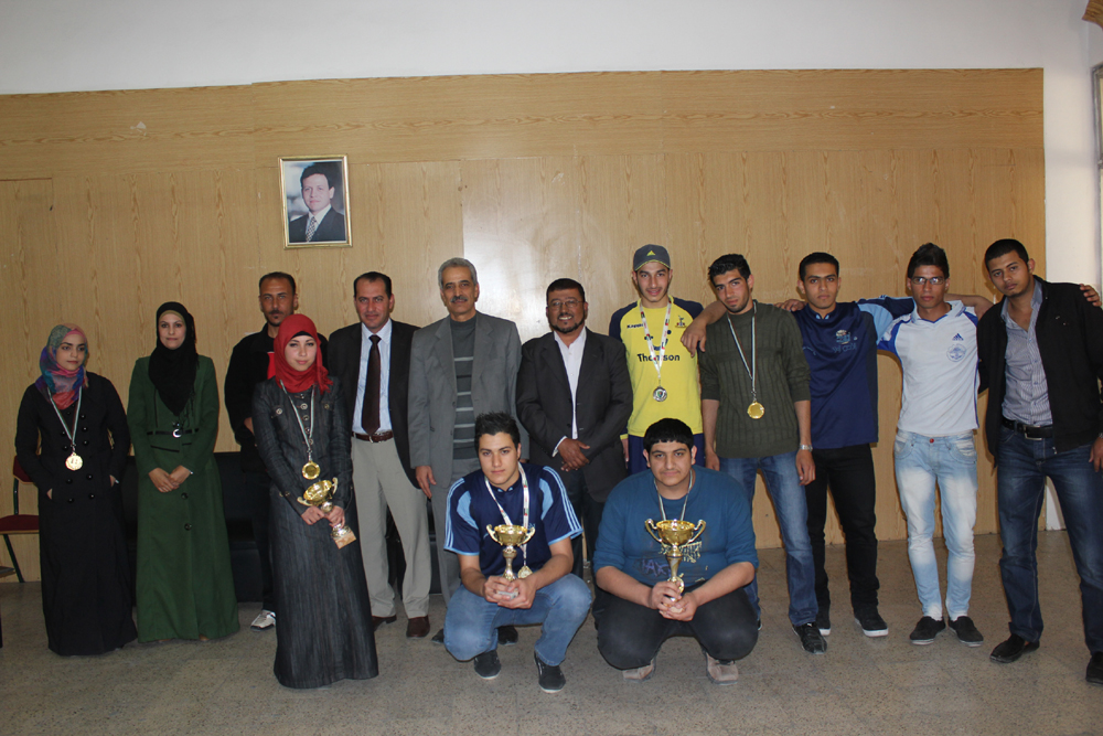 والطالبات :- حيث فازت بالمركز الاول الطالبة ( لميس جوده ) وفازت بالمركز الثاني الطالبة ( اصالة علي ) ويذكر ان اكثر من (100) طالب شاركوا في هذه المسابقات وكان حكم اللقاء المشرف ( فارس الغريب ) وفي الختام توج عميد الكلية الدكتور جمال اصبيحات الميداليات والكؤوس على الفائزين .