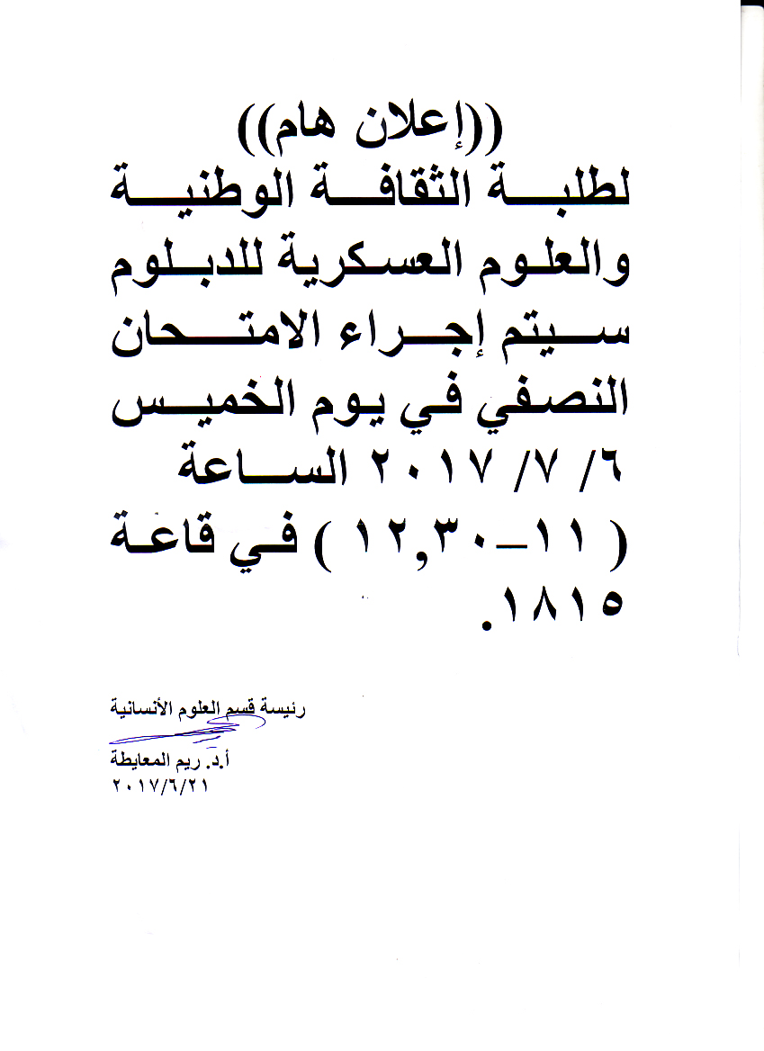 اعلان لطلبة الثقافة الوطنية والعلوم العسكرية الدبلوم