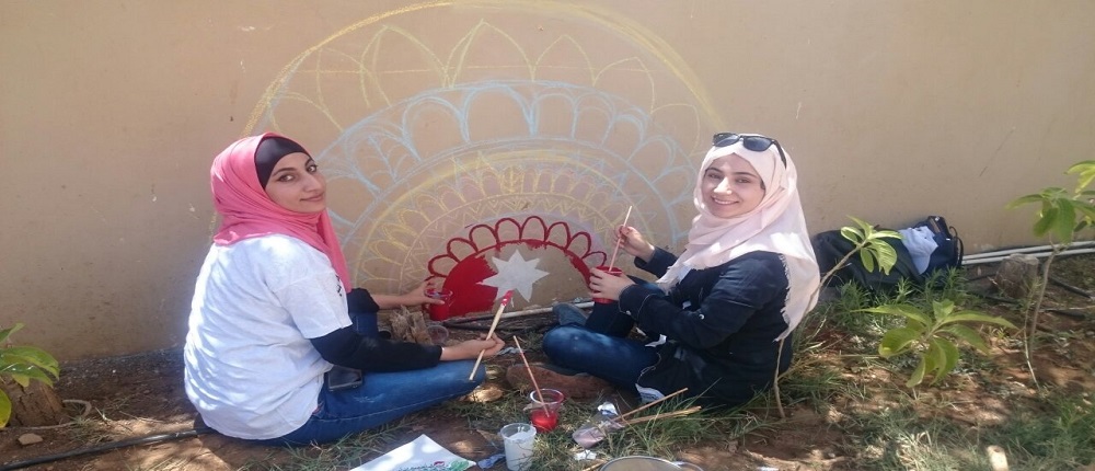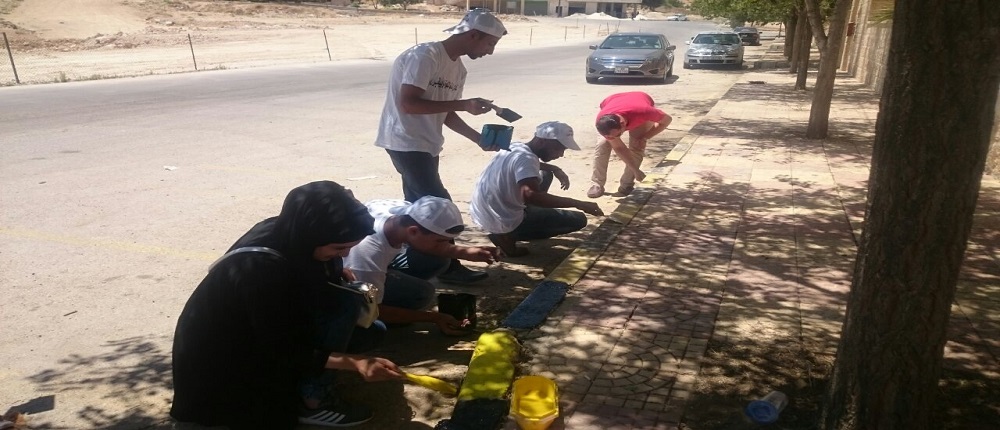 وكذلك دهان الأرصفة ورسم على الجدران جداريات وطنية وكذلك تقليم أشجار الكلية .