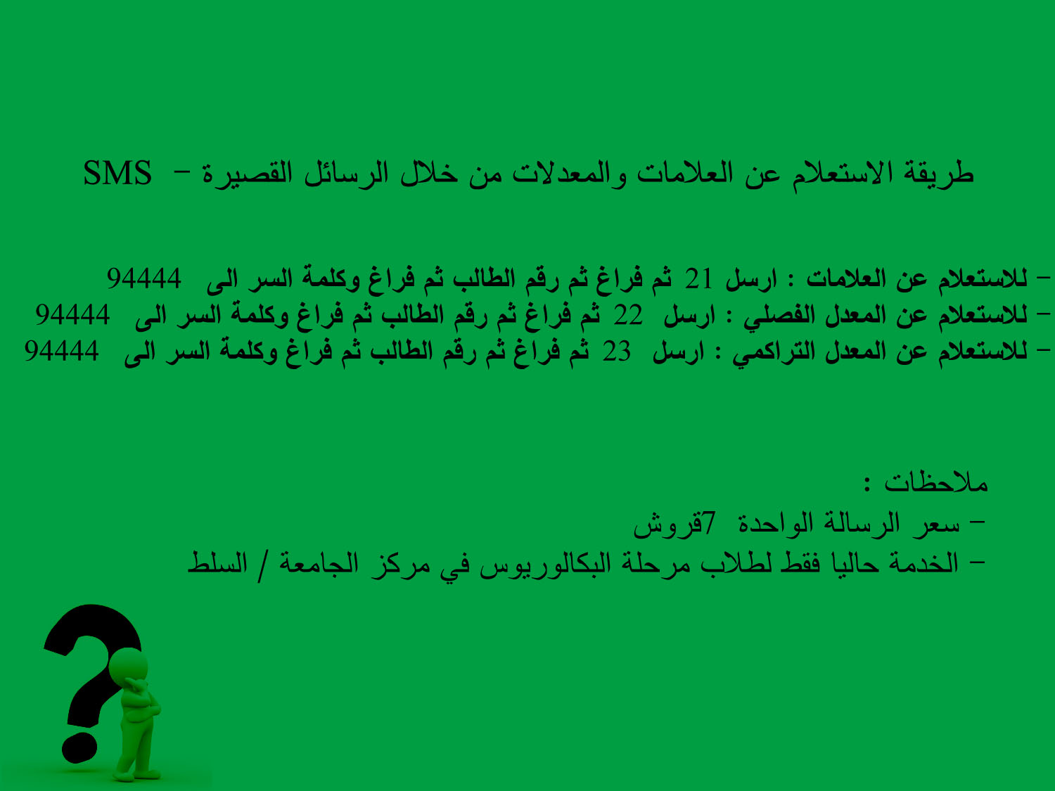 اصبح بإمكانكم الان الاستفسار عن العلامات او المعدل الفصلي او المعدل التراكمي لهذا الفصل عن طريق الرسائل القصيرة SMS